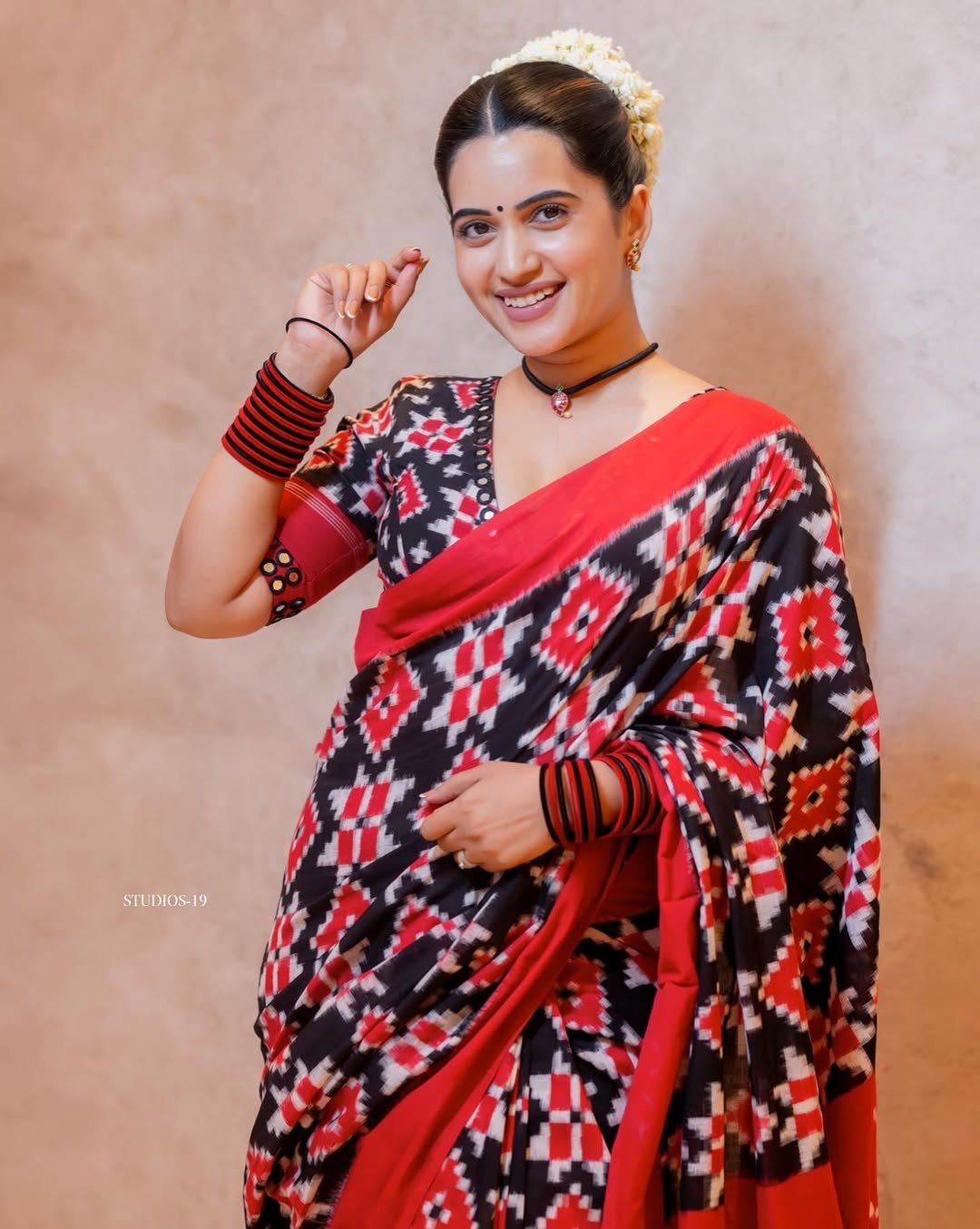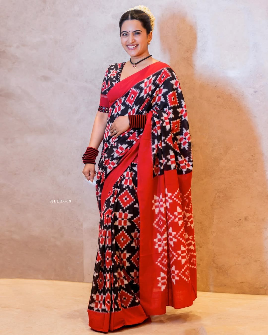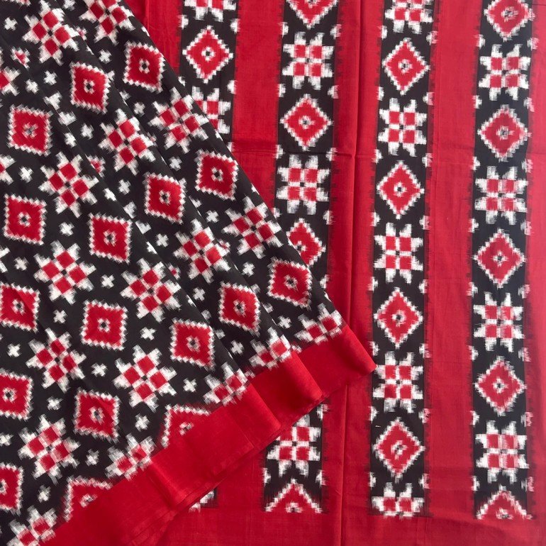 - Work: Black & Red Telia Rumal Cotton Saree with Double Ikkat Red Motifs, with Plain Red Border.
