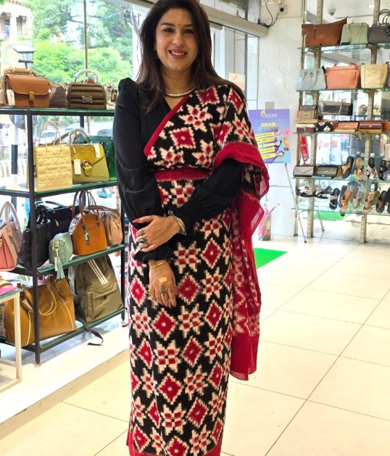 - Work: Traditional Black & Red Puttapaka Telia Rumal Cotton Saree. Red Double Ikkat pattern with Red Border and Pallu.
