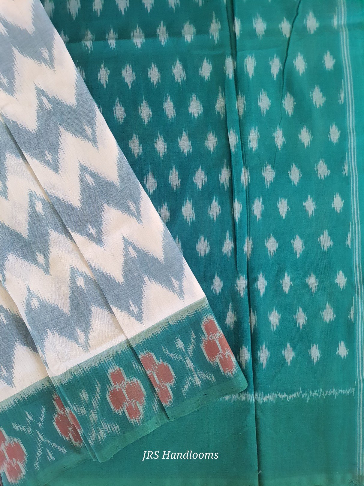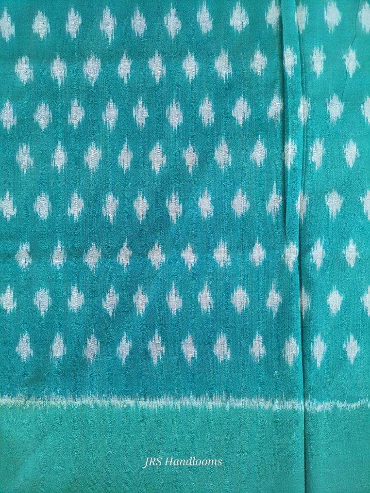 The saree is framed with a green Ikat design border, complementing the geometric patterns on the body and enhancing the saree’s overall visual harmony.
