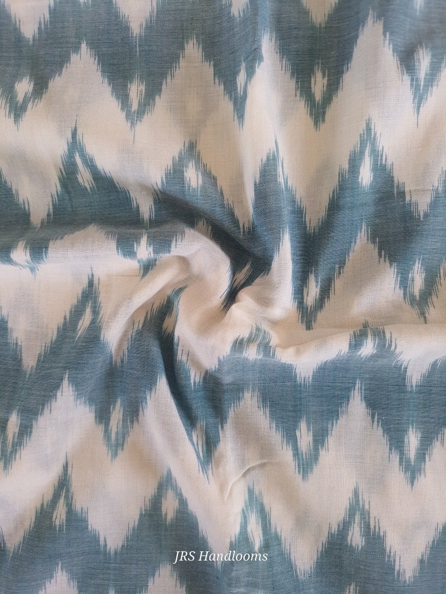The saree body features a clean white base with green geometric Ikat patterns woven all over, giving the saree a balanced and refreshing look. The design is created using the Single Ikat tie-and-dye weaving technique, where the warp yarns are carefully tied and dyed before being set on the handloom for weaving, resulting in the signature handcrafted Ikat appearance.