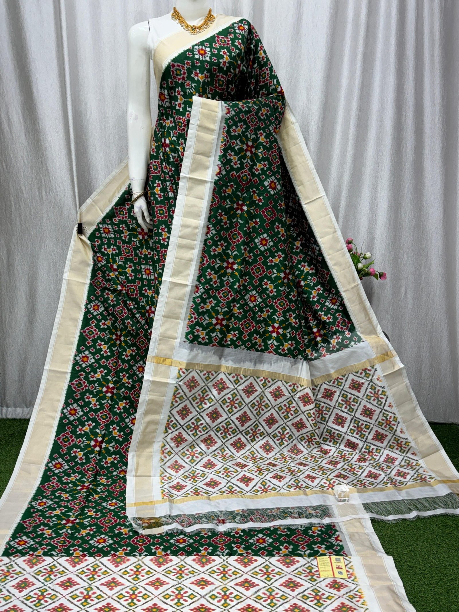 The saree body features a deep dark Green base, beautifully adorned with geometric white and red Navratan Patola-inspired Ikat motifs woven all over. Crafted using the Single Ikat weaving technique, the silk yarns are first tied and resist-dyed according to the design, and then carefully set on the loom before weaving. This traditional method gives the saree its characteristic handcrafted charm and subtle softness in motifs.