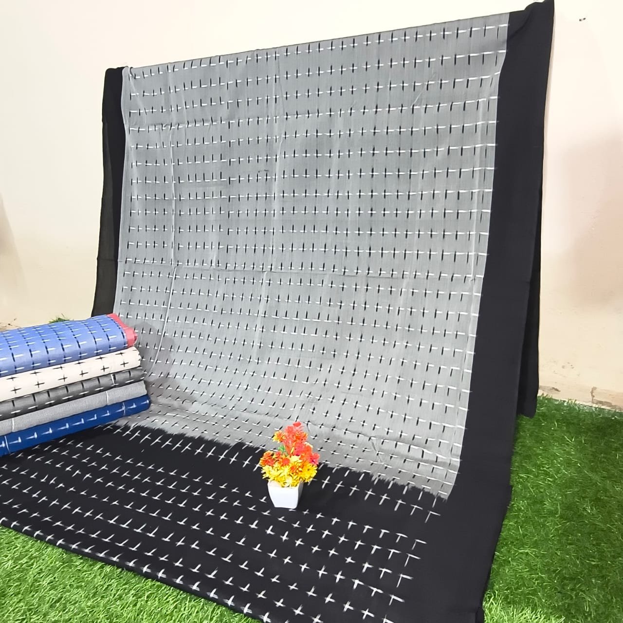 - Work: Grey Double Ikat Design, Plus Design on Grey Cotton Saree with Plain Black Border and Ikkat Plus Design Pallu.