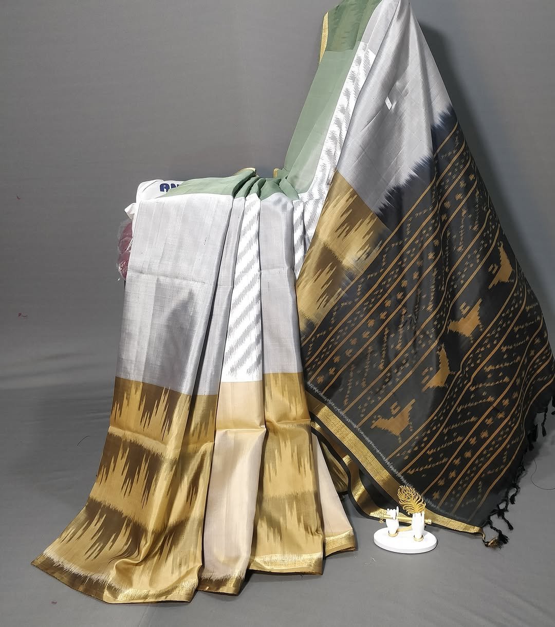 - Work: Designer Grey – Green Pochampally Ikat Silk Saree With Ikkat Design and Golden Big Border Border and, Black Ikat Pallu.
