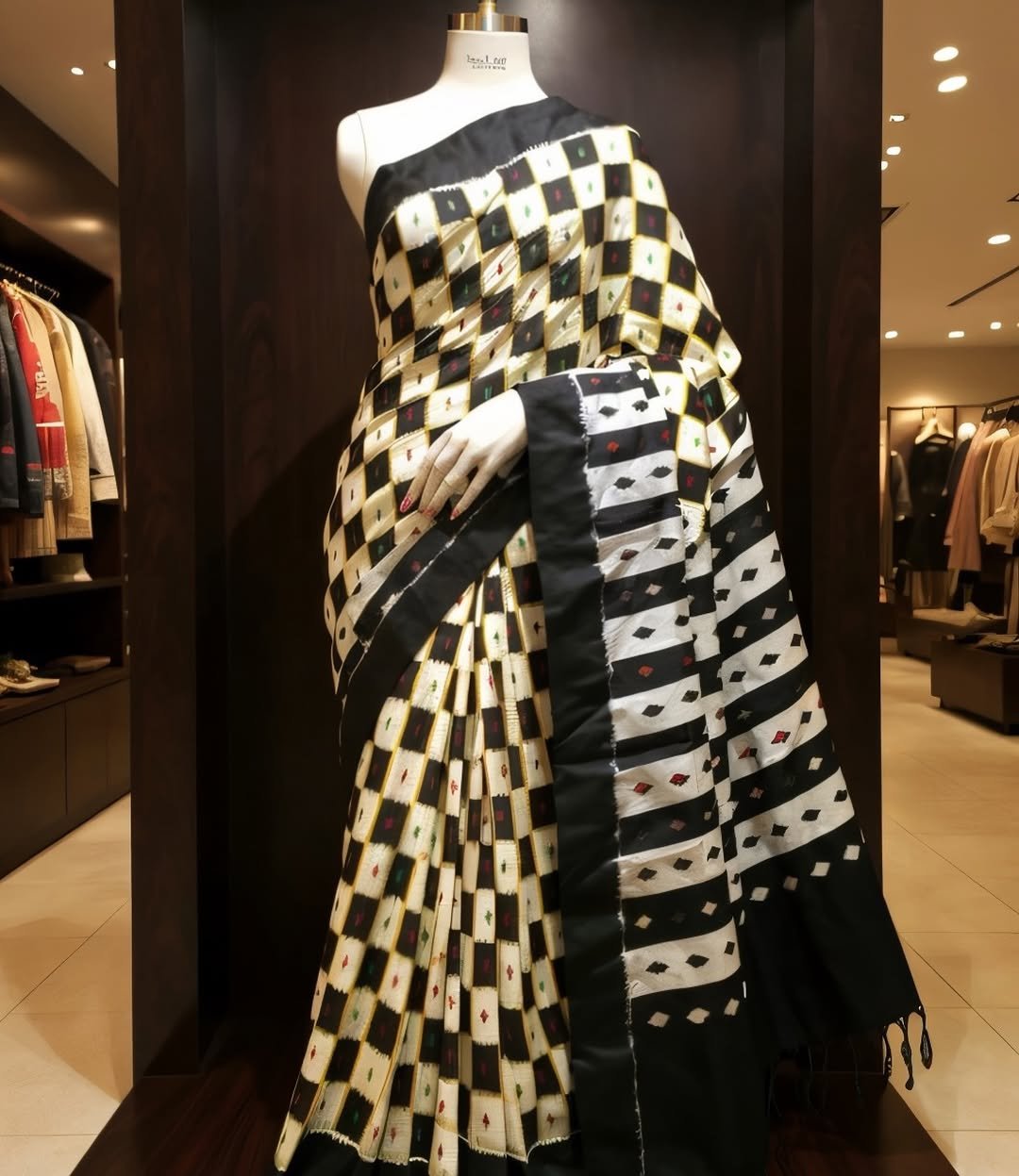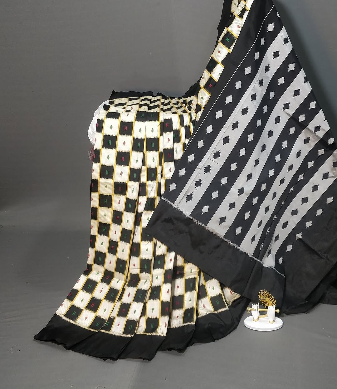 - Work: Designer Off White, Black Pochampally Ikat Silk Saree With Chequered Ikkat Patterns & Pallu. Plain Black Border.