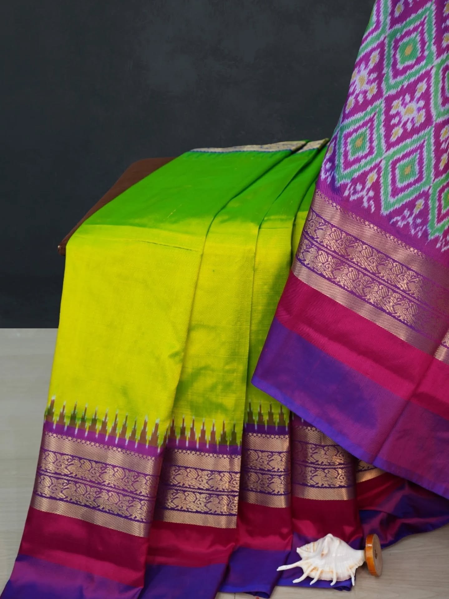 Lemon Green Silk Pochampally Ikkat Saree – Kanchipuram Border