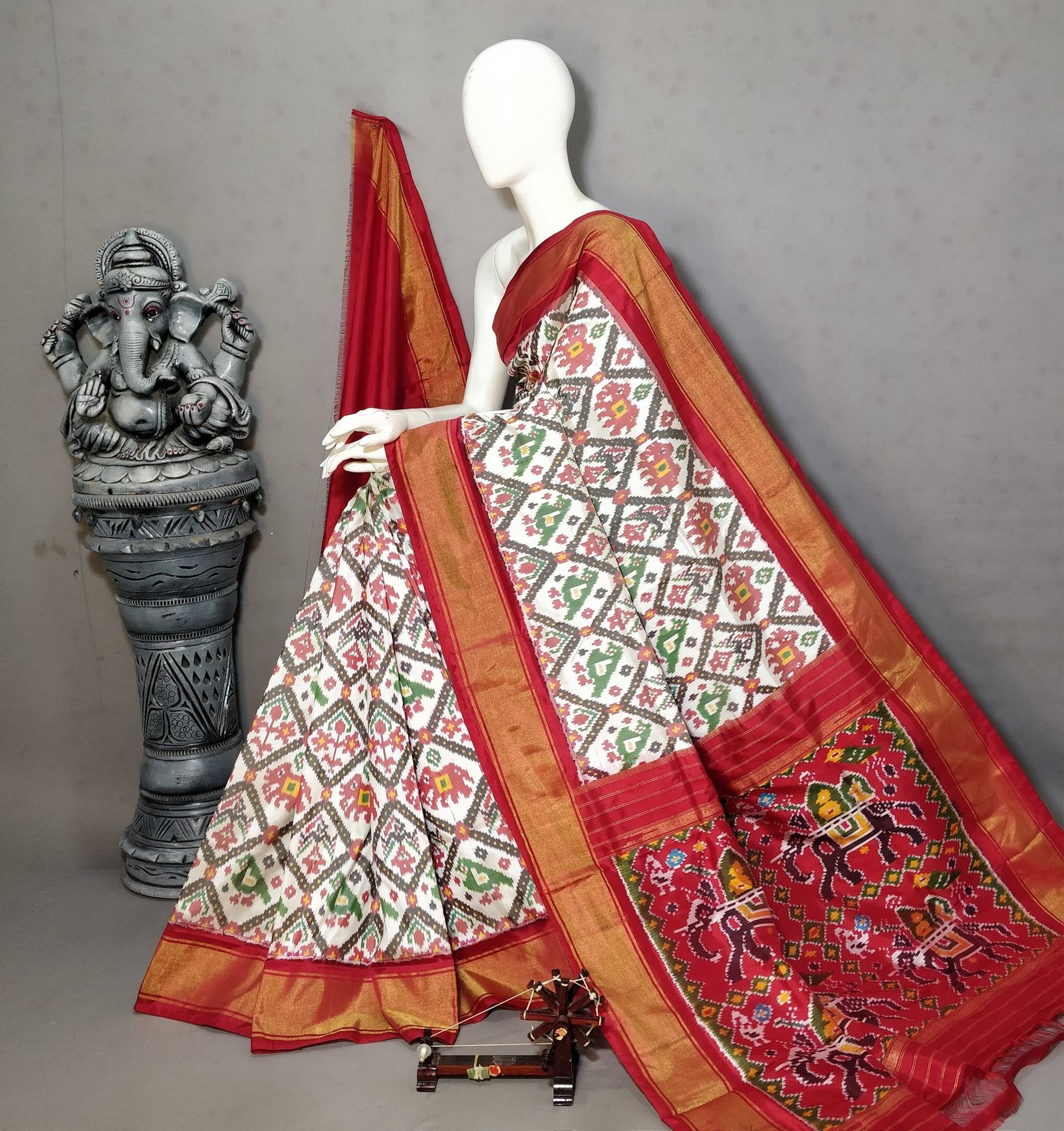 The saree features a white base filled with Navratan Patola-inspired Ikat designs, where red and green animal motifs are arranged inside geometric rhombus patterns. Created using the Single Ikat tie-and-dye technique, the yarns are dyed before weaving, resulting in a handcrafted look with soft-edged motifs.
