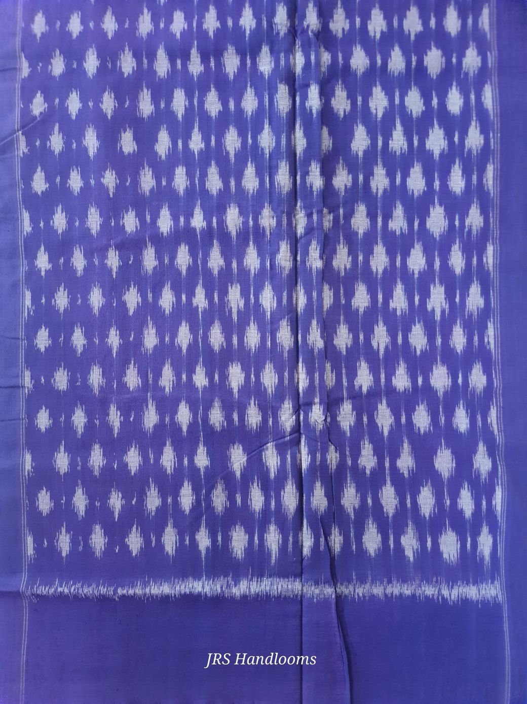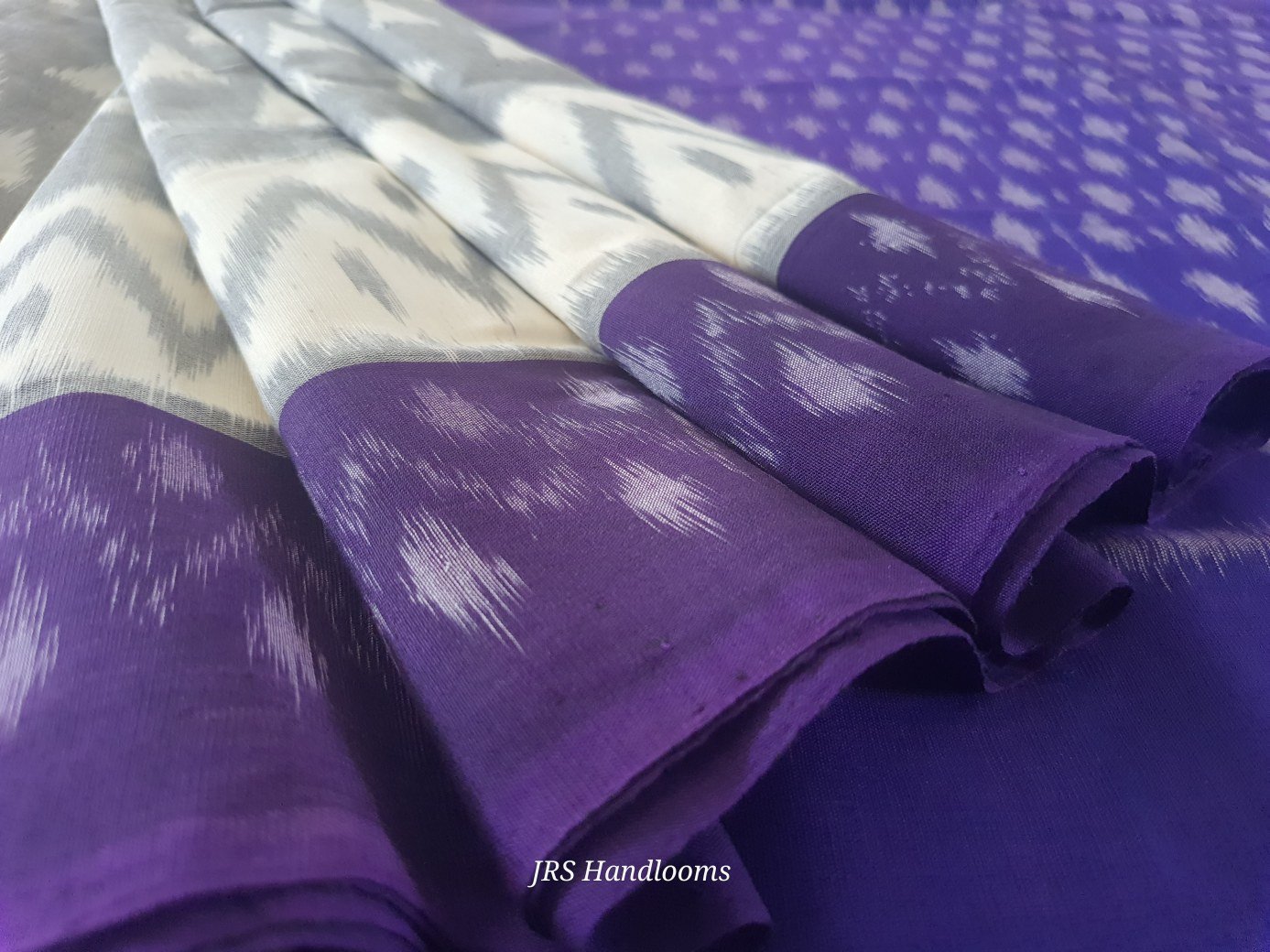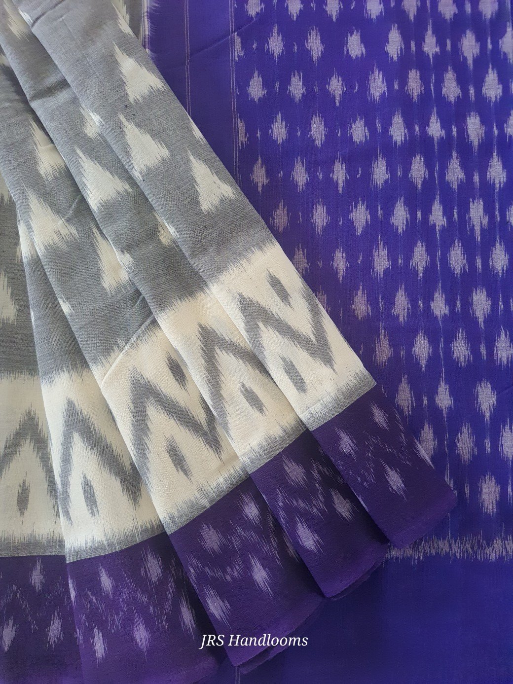 The saree is framed with a violet Ikat border, along with white and grey Ikat patterns running along the border, giving the saree a stylish and traditional contrast.