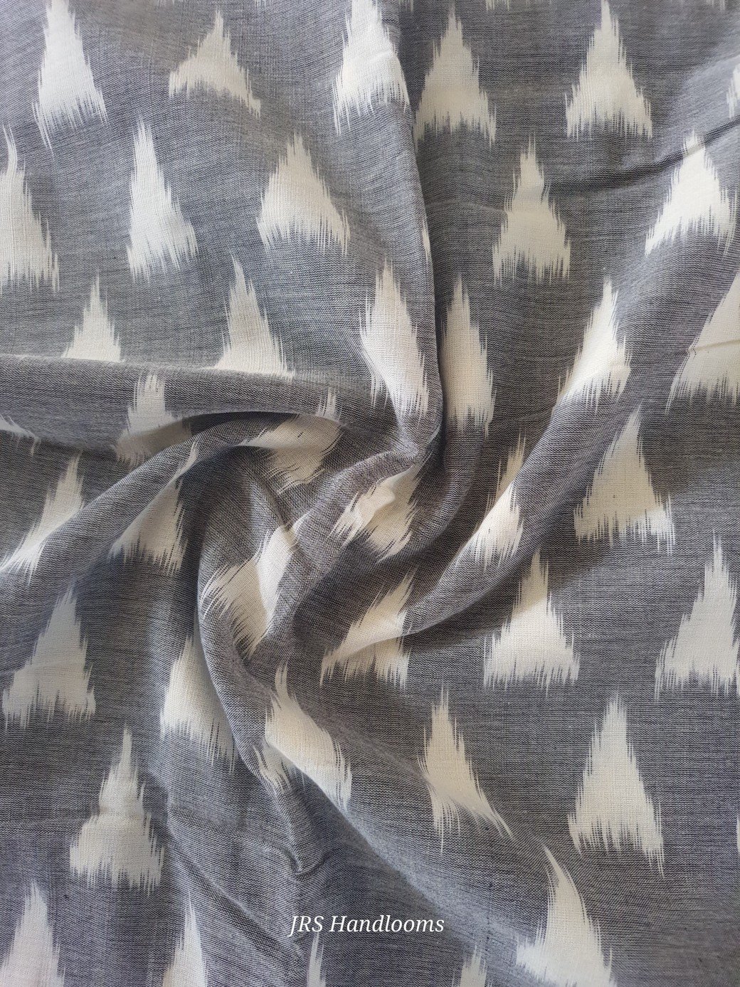 The saree body features a beautiful grey base decorated with white geometric Ikat triangle patterns woven throughout the saree, creating a balanced and elegant look. The motifs are produced using the Single Ikat tie-and-dye technique, where the warp yarns are tied and dyed before being carefully aligned on the handloom, resulting in the distinctive handcrafted Ikat appearance.