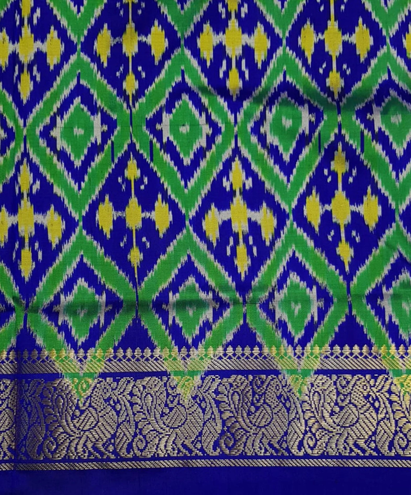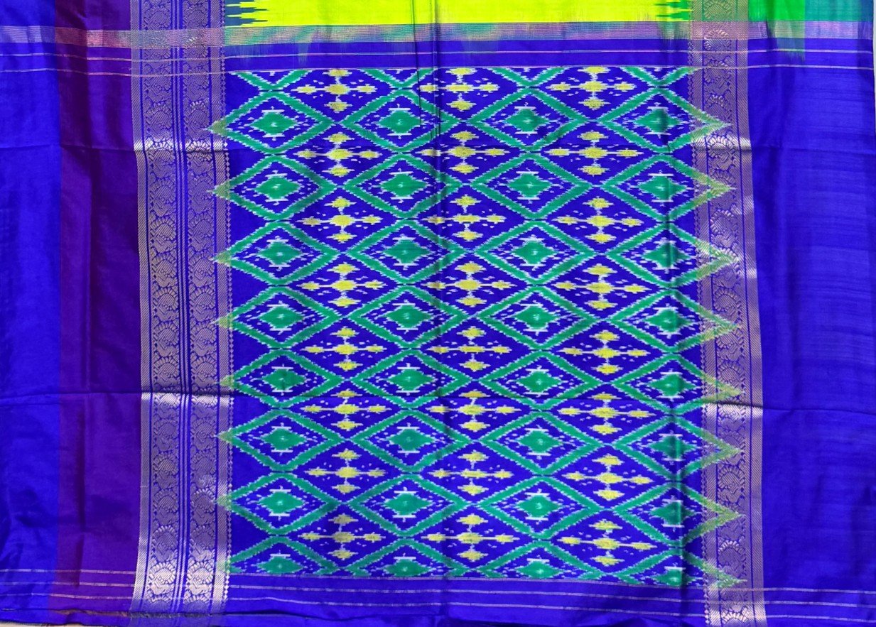 The pallu is adorned with blue and green Ikat geometric patterns, showcasing the precision of the Ikat tie-and-dye technique, where yarns are dyed first and then woven carefully on the loom to form intricate designs.