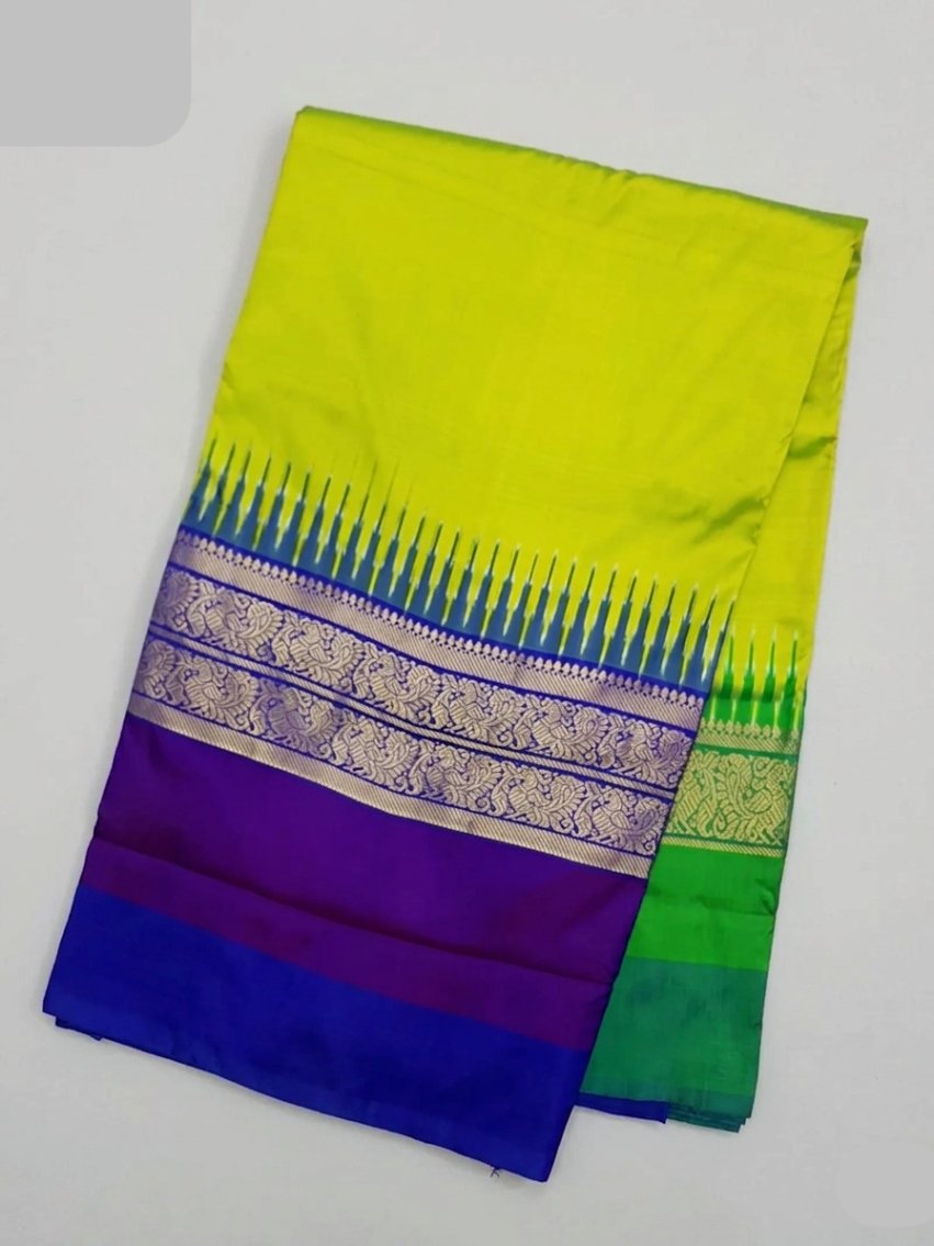 The saree features a traditional plain lemon green body, creating a bright and auspicious look ideal for celebrations. Enhancing its beauty are the classic ikkat Ganga Jamuna borders woven on both sides in blue, violet, and green, symbolizing harmony and traditional aesthetics. Adding grandeur to the saree is a rich golden Kanchipuram-style border, which elevates the saree with a regal and wedding-ready appeal.