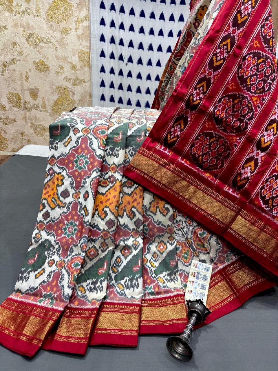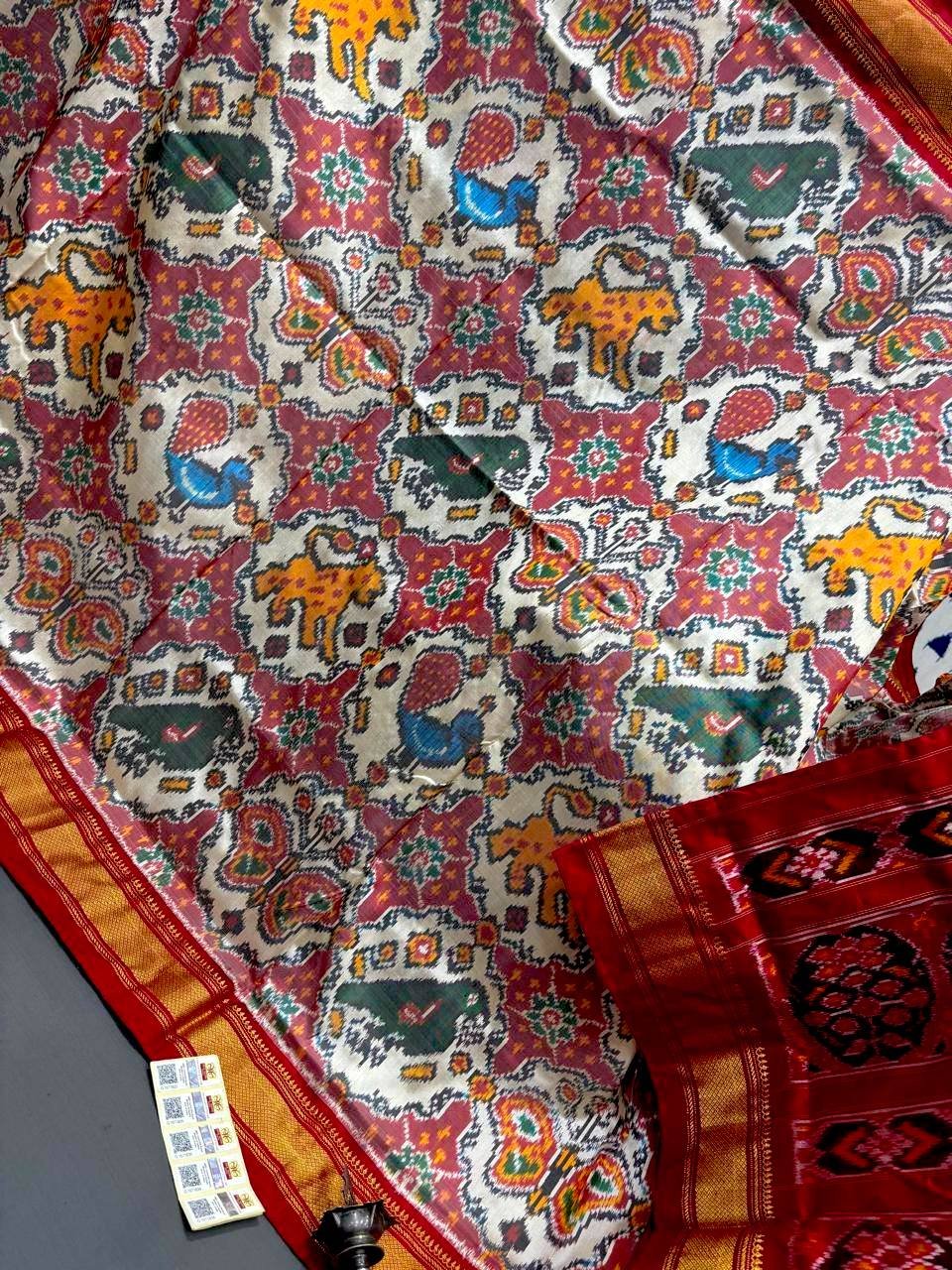 The saree body is filled with Chhabdi Patola-inspired Ikat patterns, featuring animals and floral motifs arranged within geometric layouts in white and red. Made using the Single Ikat tie-and-dye technique, the yarns are dyed before weaving, giving the motifs a slightly soft, handcrafted edge that defines authentic Ikat.