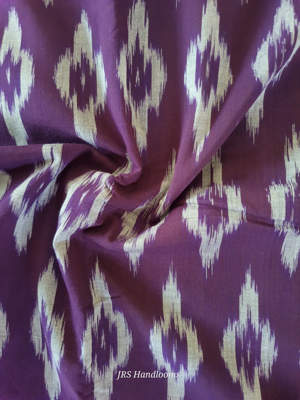 The saree body features a rich dark purple base adorned with white Ikat motifs woven across the fabric, creating a striking and balanced look. The patterns are produced using the Single Ikat tie-and-dye weaving technique, where the warp yarns are carefully tied and dyed before weaving on the handloom, giving the saree its characteristic handcrafted Ikat appearance.