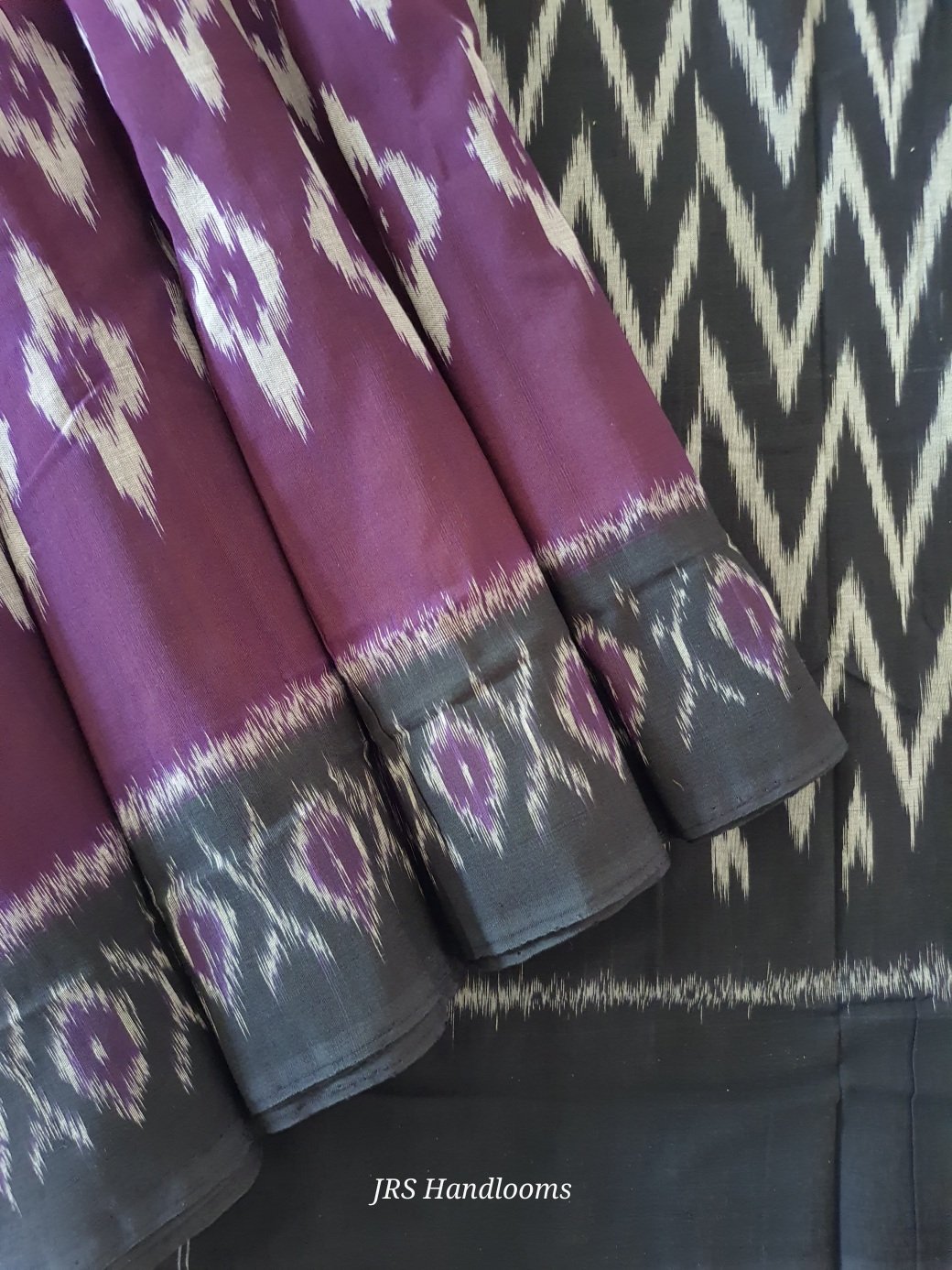 The saree is beautifully framed with a black Ikkat border, adding depth and contrast that enhances the elegance of the purple body.