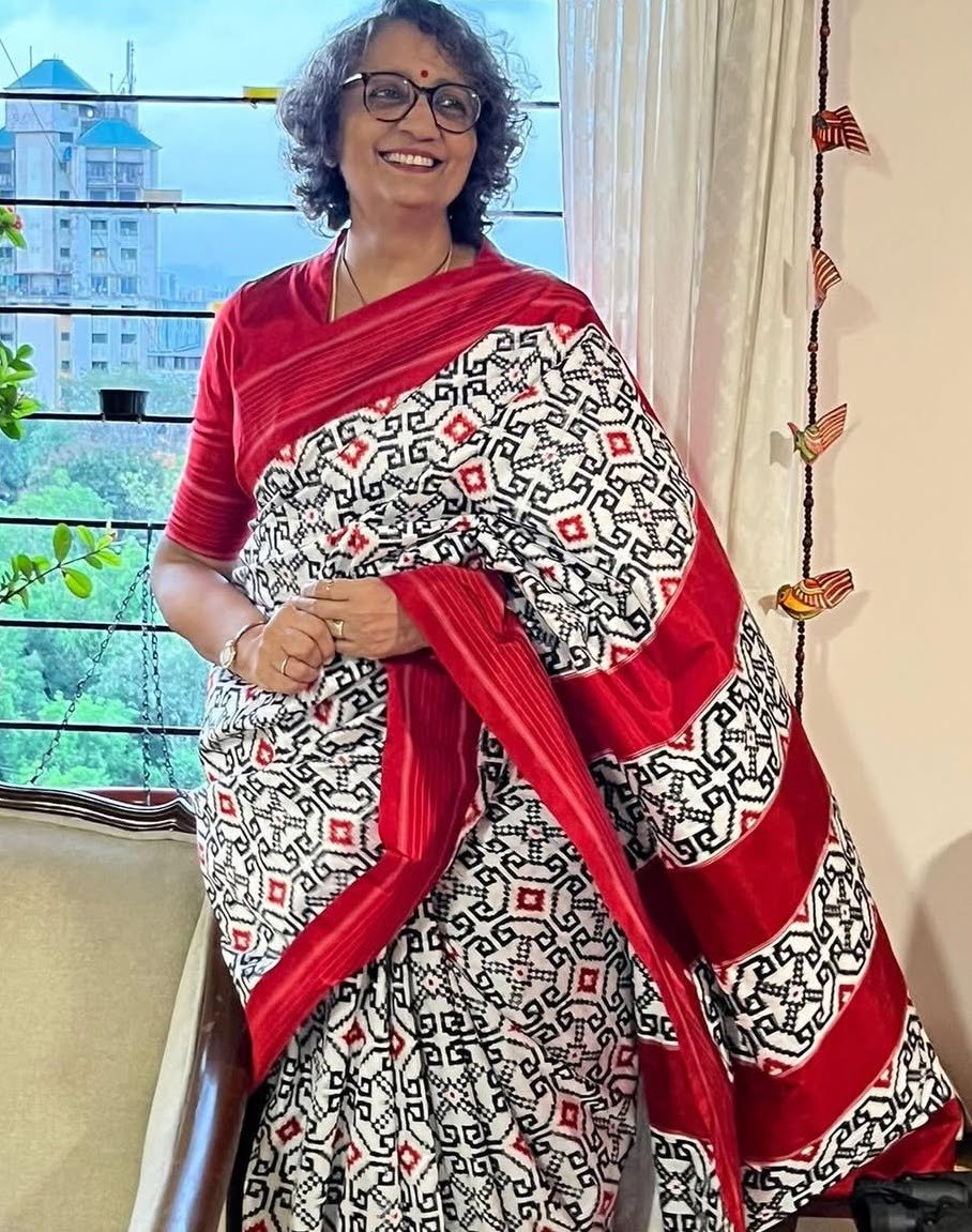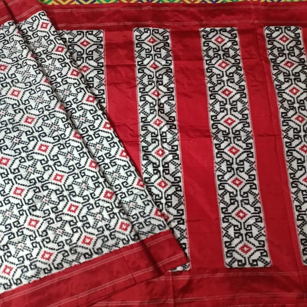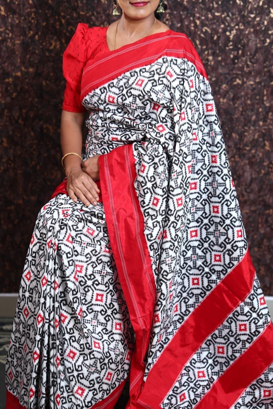 + Free ShippingExperience the charm of tradition with this Pure White Handloom Cotton Telia Rumal Saree, beautifully adorned with black and red double Ikat geometric patterns. The saree features a classic plain red border that adds a bold, timeless touch to its overall look. Paired with an unstitched blouse in matching border colour, this piece blends simplicity with rich handloom artistry.