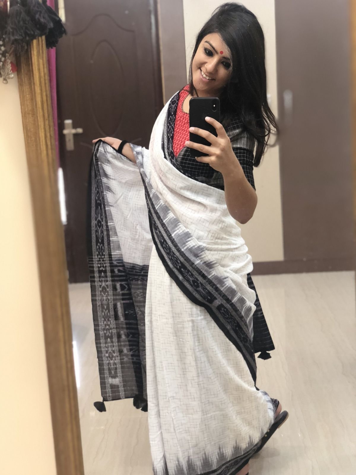 - Work: White Handloom Ikkat Cotton Saree With Black Border and Pallu.