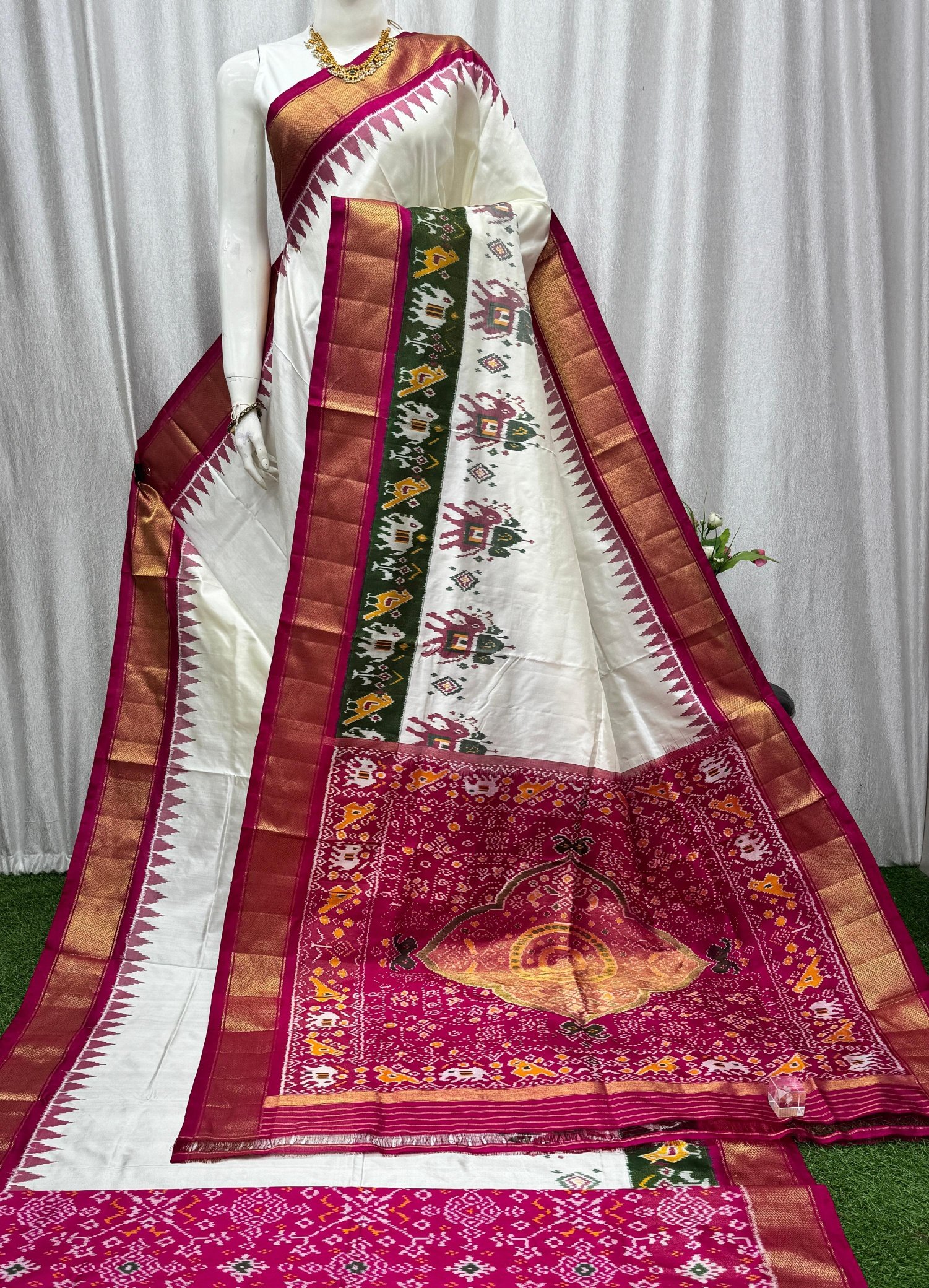 • Work: Pochampally Plain White Saree Body with Ambari Elephant Design All Along the Multiple Borders. Has red Kaddi border & green Elephant Design Border. Pallu comes with the red rich Ikkat patola design.