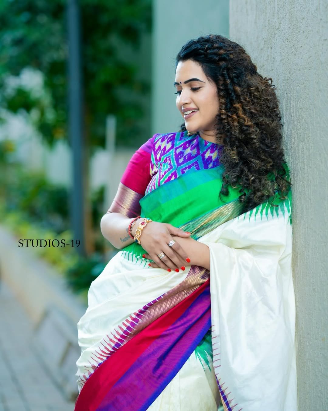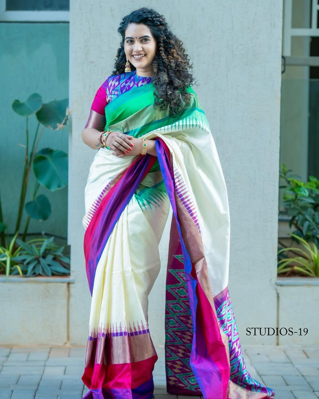 This pure Mulberry silk Pochampally ikkat silk saree is a timeless handloom creation that reflects elegance, tradition, and refined craftsmanship. Woven by skilled artisans, the saree features a traditional plain off-white silk Ikat body, offering a serene and graceful look that suits both festive and religious occasions.