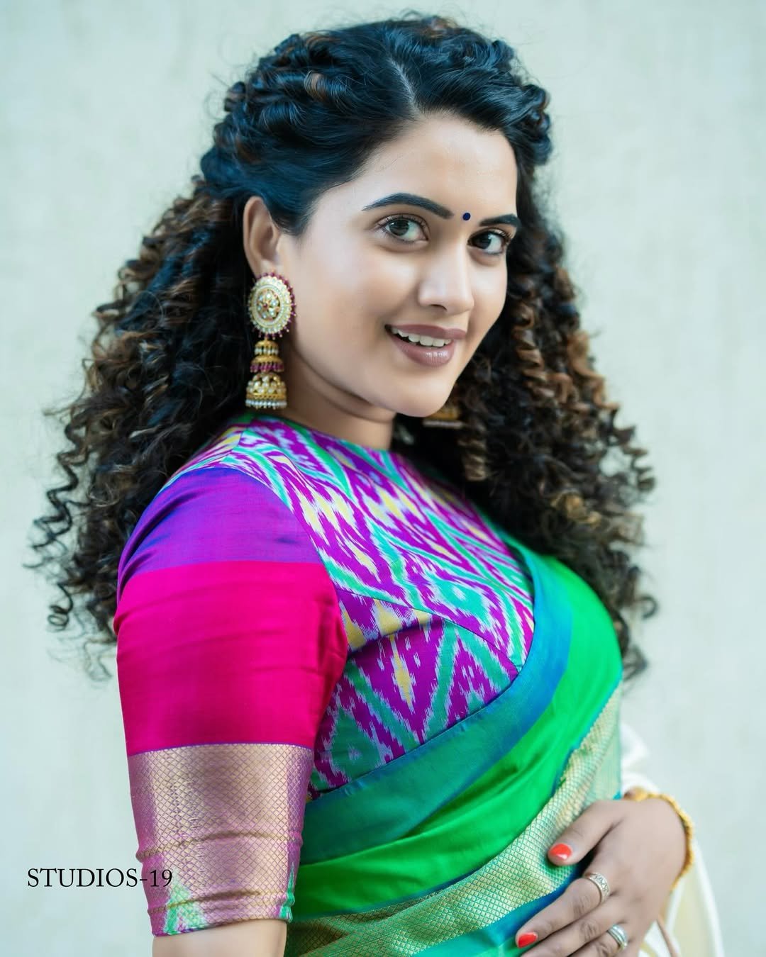 The saree comes with a matching pink and green Ikat geometric design blouse, unstitched for custom styling.